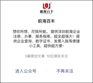 微信關注“前海百豐”公眾號,將企業添加收藏,即可隨時隨地查詢公司信息、監控公司狀態。