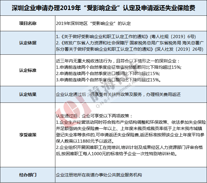 根據《轉發廣東省人力資源和社會保障廳 國家稅務總局廣東省稅務局 海關總署廣東分署關于做好受影響企業和職工認定工作的通知》(深人社發〔2019〕26號),若深圳企業被認定為“受影響企業”,可以享受包括“申請返還失業保險費”和“在職困難員工一次性特別困難補助”,具體通知介紹請參見前海百豐說明圖所示。