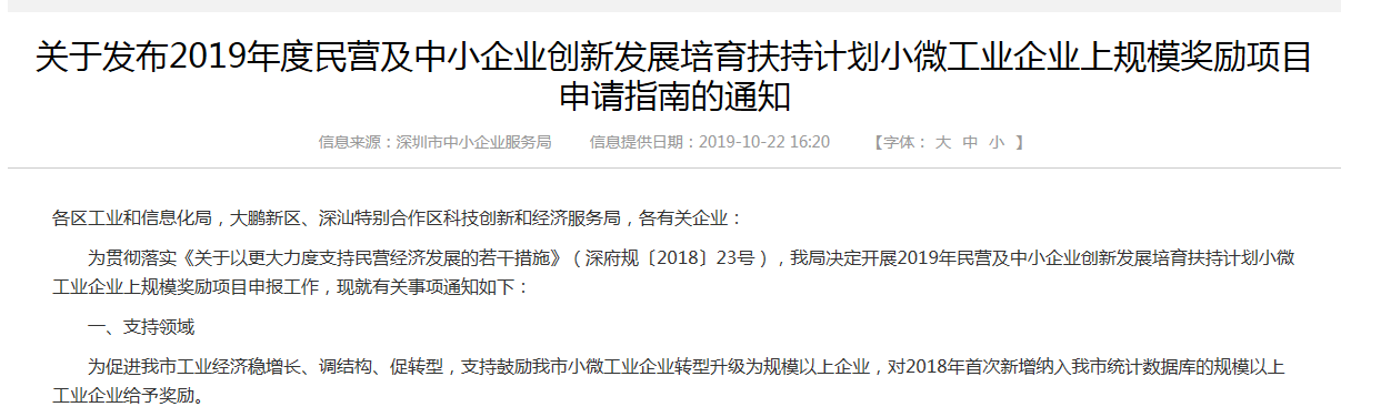昨日深圳市中小企業服務局發布《2019年度民營及中小企業創新發展培育扶持計劃小微工業企業上規模獎勵項目申請指南》,對于在深圳市注冊的民營及中小企業,滿足從2018年1月1日起至2018年12月31日止首次新增納入深圳市統計數據庫的規模以上工業企業,直接給予一次性10萬元獎勵,但是需自主申報。下面我們來看一下具體要求: