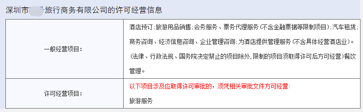 括號的字樣是審核的時候的限定描述,這家公司實際上還有一個經營范圍,是旅游服務,這是一個許可經營范圍,屬于后置許可,如圖: