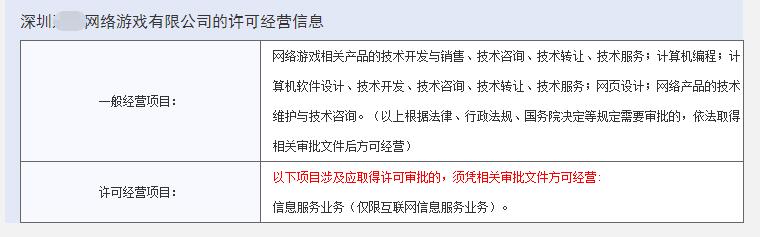 如圖,這家公司是比較普遍的網絡游戲公司經營范圍,一般經營范圍:網絡游戲相關產品的技術開發與銷售、技術咨詢、技術轉讓、技術服務;計算機編程;計算機軟件設計、技術開發、技術咨詢、技術轉讓、技術服務;網頁設計;網絡產品的技術維護與技術咨詢。需要注意的是這家公司有一項是許可經營范圍:信息服務業務(僅限互聯網信息服務業務)。需拿到相關許可方能經營。