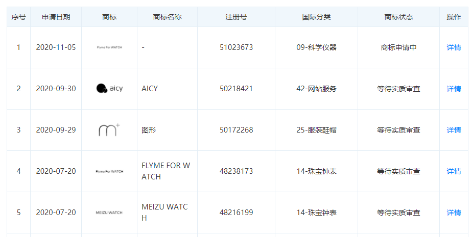 11月5日,珠海市魅族科技有限公司申請注冊“Flyme For WATCH”商標,國際分類為9類科學儀器,商標狀態為注冊申請中,此前該公司曾于7月20日注冊該商標14類珠寶鐘表。