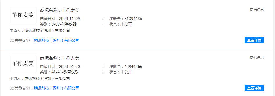 近日,騰訊科技(深圳)有限公司新增多條商標信息,商標名為“羊你太美”,國際分類涉及教育娛樂與科學儀器,其中前者已完成注冊,后者還在申請階段。