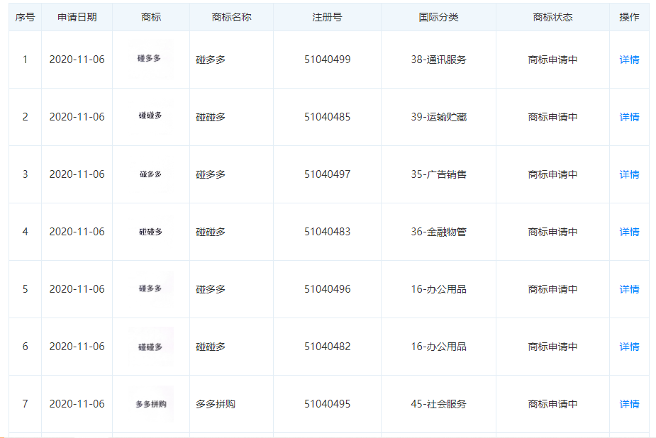 近日,拼多多的關(guān)聯(lián)公司上海尋夢(mèng)信息技術(shù)有限公司新增多條商標(biāo)信息,商標(biāo)名為“碰多多”、“碰碰多”、“多多拼購(gòu)”等,國(guó)際分類涉及運(yùn)輸儲(chǔ)藏、通訊服務(wù)、廣告銷售等,商標(biāo)狀態(tài)顯示為“商標(biāo)申請(qǐng)中”。