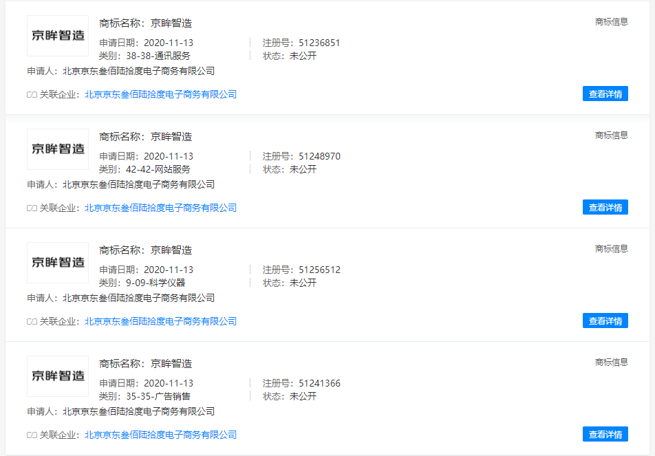 近日,北京京東叁佰陸拾度電子商務有限公司新增多條名稱為“京眸智造”的商標信息,申請日期在2020年11月,涉及國際分類包括通訊服務、科學儀器、廣告銷售、網站服務等,商標狀態均為商標申請中。北京京東叁佰陸拾度電子商務有限公司成立于2007年4月,注冊資本為9.2億人民幣,法定代表人為劉強東。