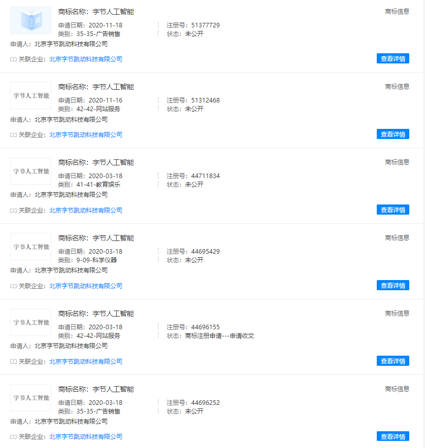 字節跳動申請“字節人工智能”商標