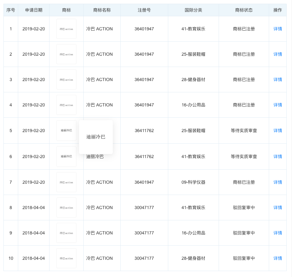 霍爾果斯嘉行影視文化有限公司目前已將“迪麗冷巴”“冷巴 ACTION”等申請(qǐng)注冊(cè)商標(biāo),涉及的國(guó)際分類包含服裝鞋帽、健身器材、教育娛樂(lè)、辦公用品等,目前商標(biāo)狀態(tài)涉及“商標(biāo)已注冊(cè)”、“等待實(shí)質(zhì)審查”、“駁回復(fù)審中”等。