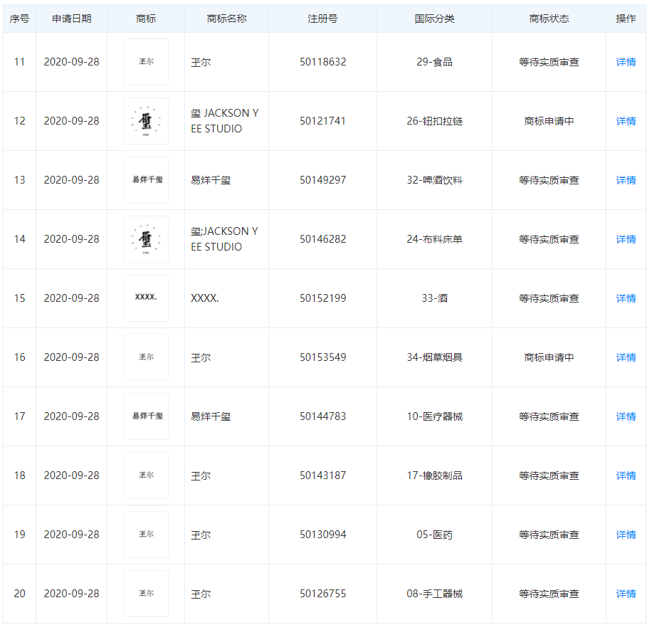 近日,徐州九木德文化發展有限公司申請注冊多個“易烊千璽”、“玊爾”、“璽 JACKSON YEE STUDIO”商標,國際分類涉及金融物管、醫療器械、食品、啤酒飲料等,商標狀態為商標申請中和等待實質審查。徐州九木德文化發展有限公司成立于2018年12月,注冊資本500萬,法定代表人為易上捷,經營范圍包括組織文化藝術交流活動。易烊千璽和易上捷為其股東,各持股50%。