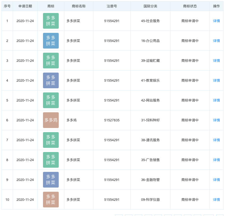 近日,上海尋夢信息技術有限公司新增“多多拼菜”“多多雞”“多多果園”等商標信息。商標涉及的國際分類包含社會服務、辦公用品、運輸貯藏、教育娛樂等,目前商標狀態為“商標申請中”。