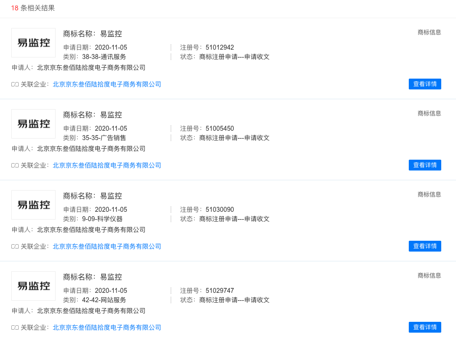 近日,北京京東叁佰陸拾度電子商務有限公司新增多條“易監控”商標信息。該商標申請日期為2020月11月5日,涉及的國際分類包含通訊服務、廣告銷售、科學儀器等。目前商標狀態為“等待實質審查”。