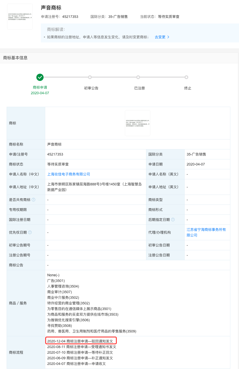 李佳琦公司曾申請注冊的“oh my god,買它買它!”聲音商標于12月4日被駁回。該商標申請注冊號為45217353,申請日期為 2020年4月7日,國際分類為廣告銷售。該商標摘要顯示,本件商標以李佳琦人聲念出“Oh my god,買它買它!”。