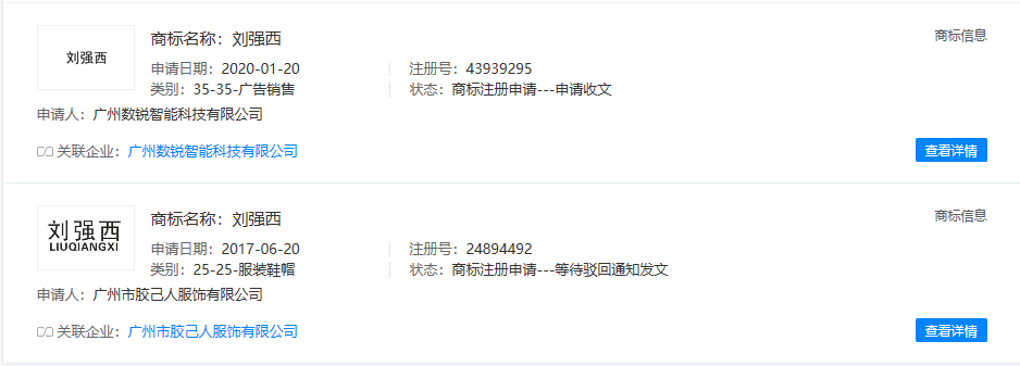 劉強西”和“章小天”已被注冊商標。今年1月,廣州數銳智能科技有限公司申請注冊“劉強西”的商標,商標國際分類為廣告銷售,該商標已于今年9月公示為“已注冊”。另外,2017年6月,廣州市膠己人服飾有限公司曾申請注冊“劉強西”的商標,商標國際分類為服裝鞋帽,目前該商標狀態顯示為“商標無效”。