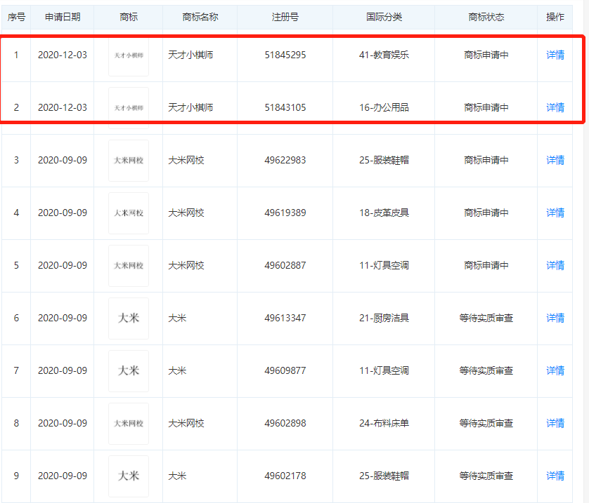 近日,北京大米科技有限公司新增多條商標信息,其中2條名稱為“天才小棋師”,申請日期均在2020年12月3日,國際分類分別為教育娛樂、辦公用品。