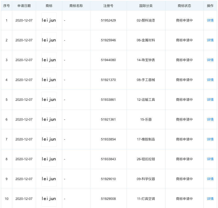 近日,小米科技有限責任公司新增多條“lei jun”商標信息,涉及國際分類包含金屬材料、運輸工具、樂器、珠寶鐘表等。申請日期為2020年12月7日。目前商標狀態為“商標申請中”
